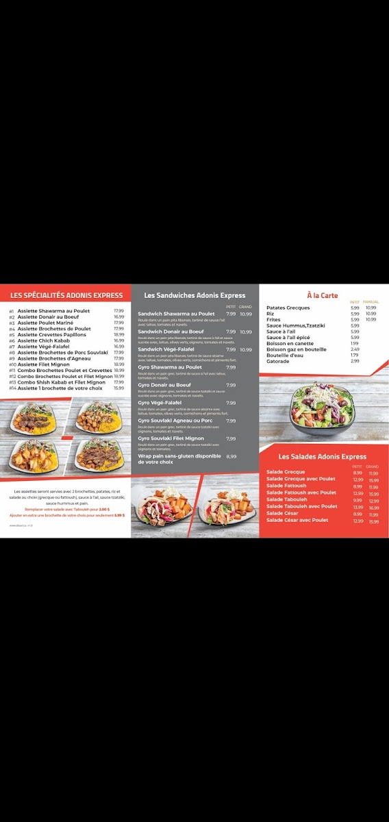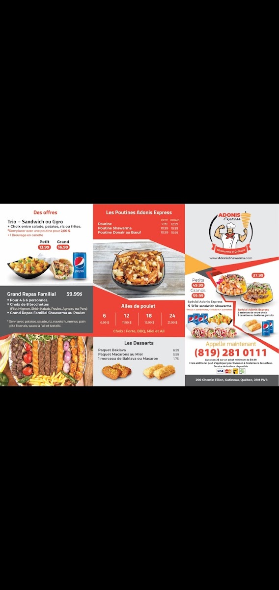Welcome to Adonis Express Shawarma et Grecque, a food gem in Gatineau, where flavor meets tradition! The menu proudly features an array of mouthwatering dishes, highlighting the beloved shawarma, renowned for its tenderness and rich spices. Guests rave about the Grand Repas Familial, a magnificent family meal laden with juicy chicken shawarma, crispy potatoes, vibrant salad, and more, perfect for gatherings. Chicken wings also take center stage, with options that cater to both small and large appetites, ensuring everyone leaves satisfied.